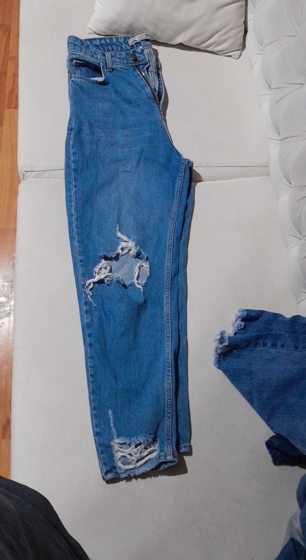 Yırtık detaylı, yarık özellikli, rahat kesim mavi kot pantolon. Günlük sokak stili için uygun, midi boyda rahat bir seçenek.