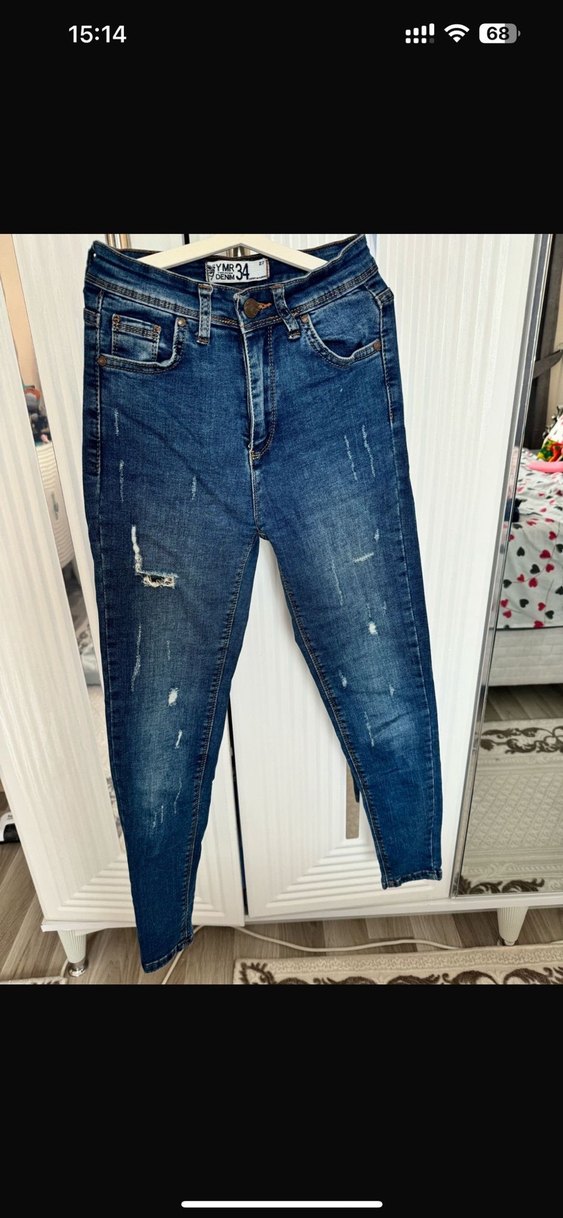 Yırtık detaylı, midi boy ve normal kesim mavi kot pantolon. Parlak kumaşı ve yırtmaç detayıyla günlük sokak stiline uygun.