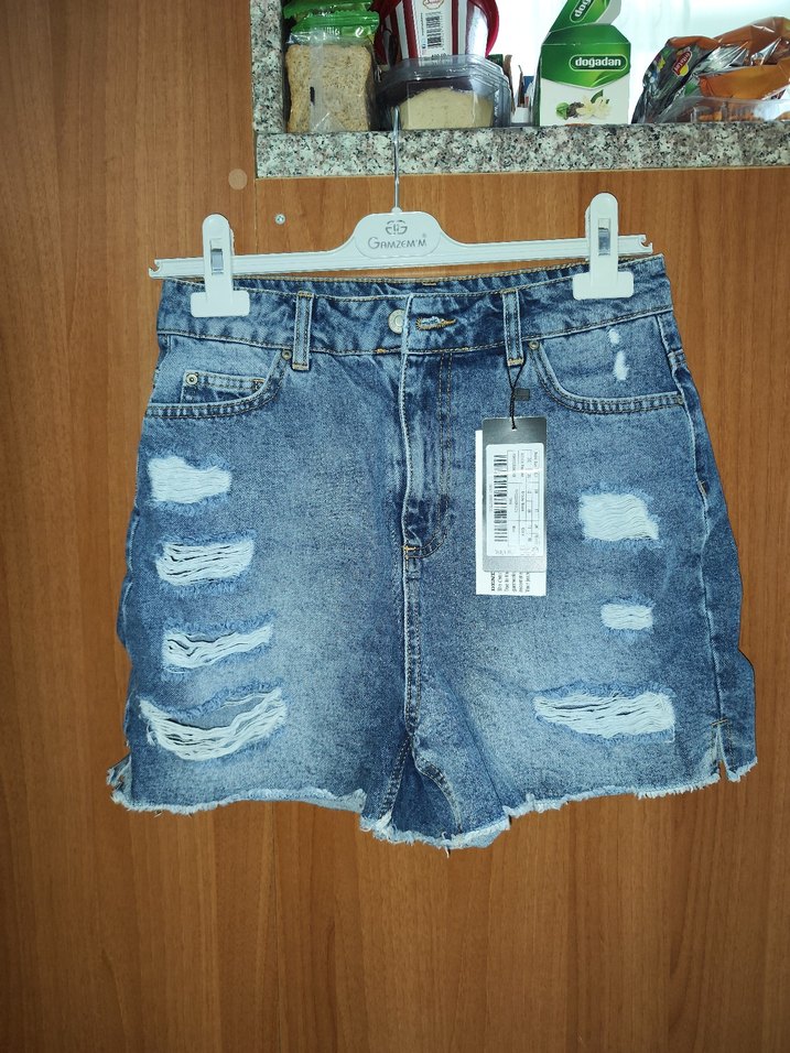 Kemerli, yıpranmış detaylı, bol kesim mavi denim mini şort. Sokak modasına uygun kısa ve kesik etek ucu ile trend görünüme sahip. Bel 37 boy 39 cm %100 pamukludur