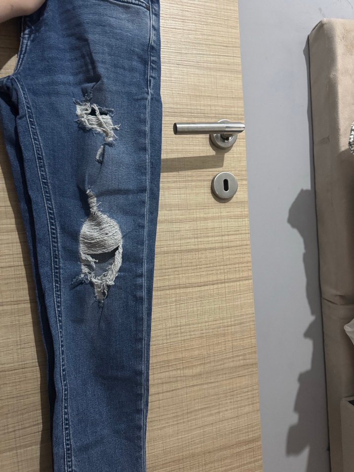 Salaş kesim, yırtık detaylı ve yırtmaçlı mavi denim pantolon, gündelik sokak stiline uygun.