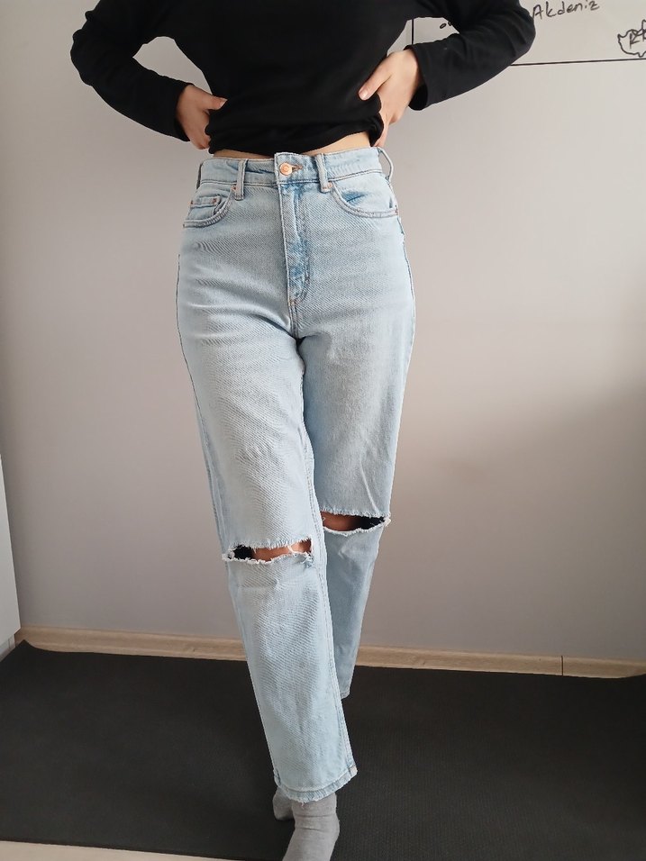 Bej renkte, dizlerinde yırtık detaylı, midi boy ve bol kesim kot pantolon. Günlük kullanım için uygun, denim kumaştan rahat ve şık bir tasarım.