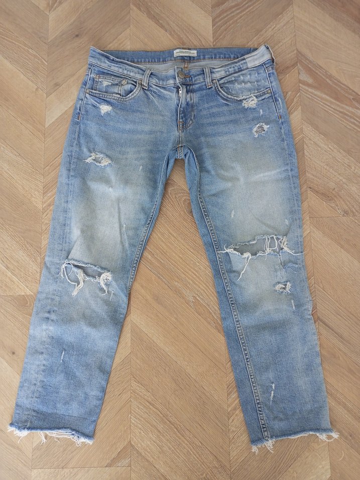Yırtık detaylı, midi boy kesime sahip bol kesim kadın kot pantolon. Gri-bej tonlarında, günlük rahat kullanıma uygun.