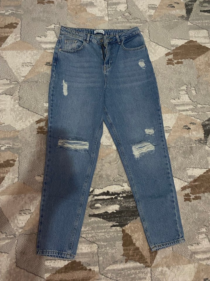 Yırtık detaylı, normal boyda, bol kesim kadın kot pantolon. Günlük kullanıma uygun, rahat ve sokak stili için ideal.