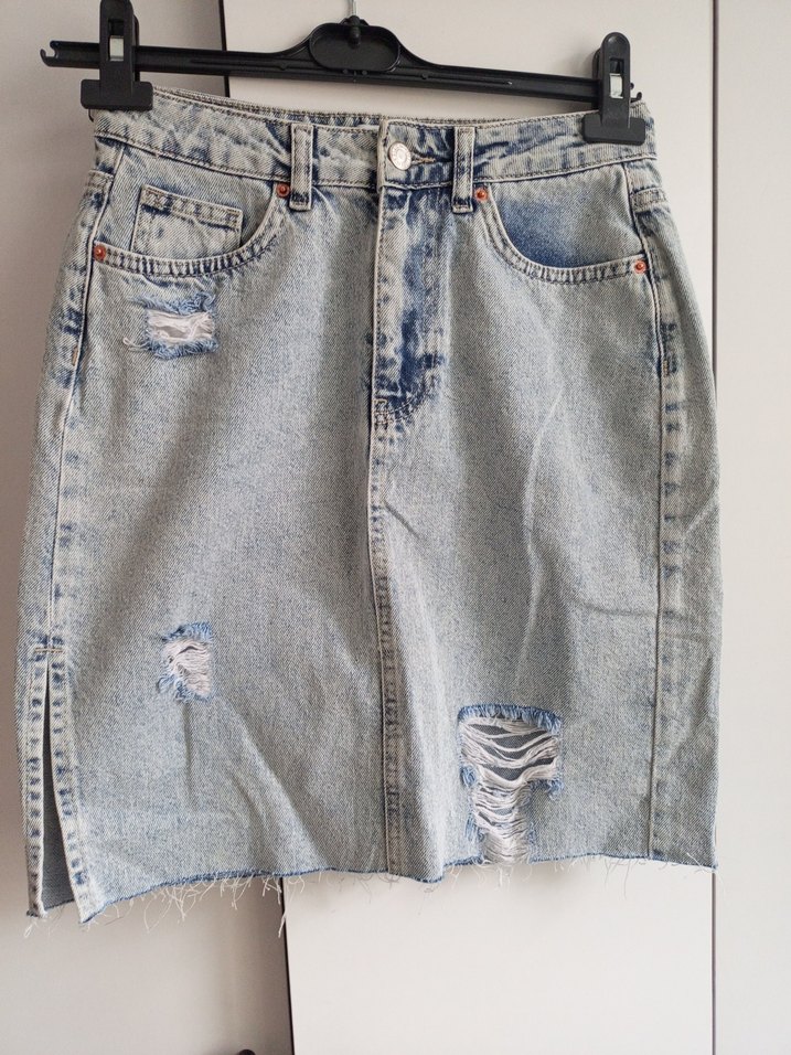 Mavi denim midi etek, yırtık detaylar ve yan yırtmaçlarla rahat bir kesim sunar, günlük sokak stiline uygundur.