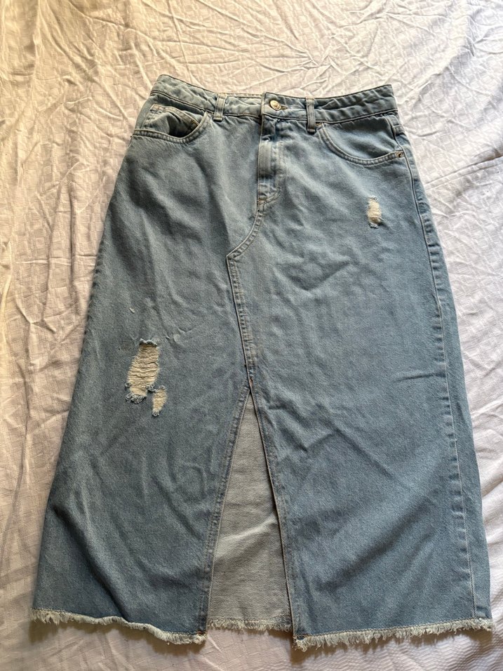 Gri-mavi renkte, yırtık detaylı, önü yırtmaçlı midi uzunlukta kot etek. Rahat ve salaş kesimiyle günlük sokak stiline uygundur.