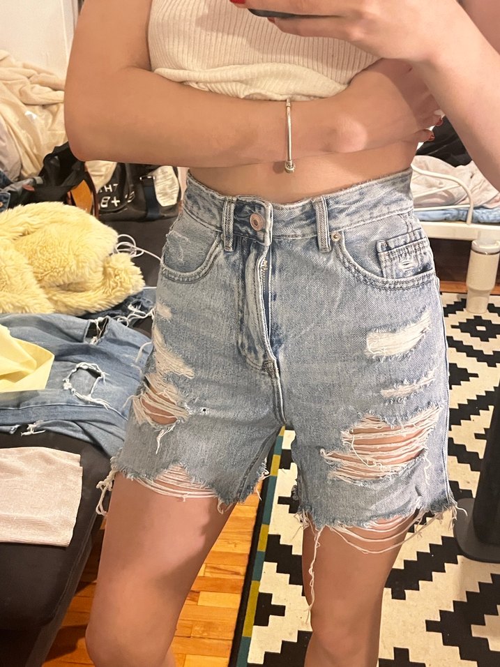 Mavi-gri tonlarda, yırtık detaylı, bol kesim midi kot şort. Kemer tokalı, günlük rahat sokak stili için uygundur.