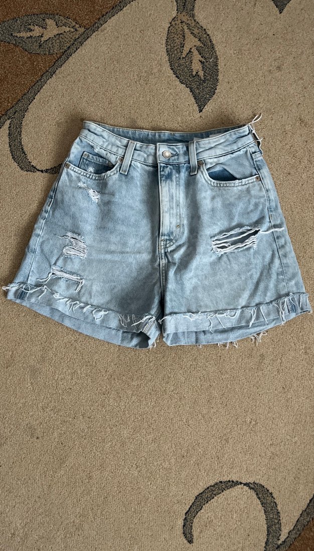 Açık mavi renkli, bol kesim kot şort. Yırtık detayları ve kıvrık paçalarıyla günlük sokak stiline uygun bir parça.
