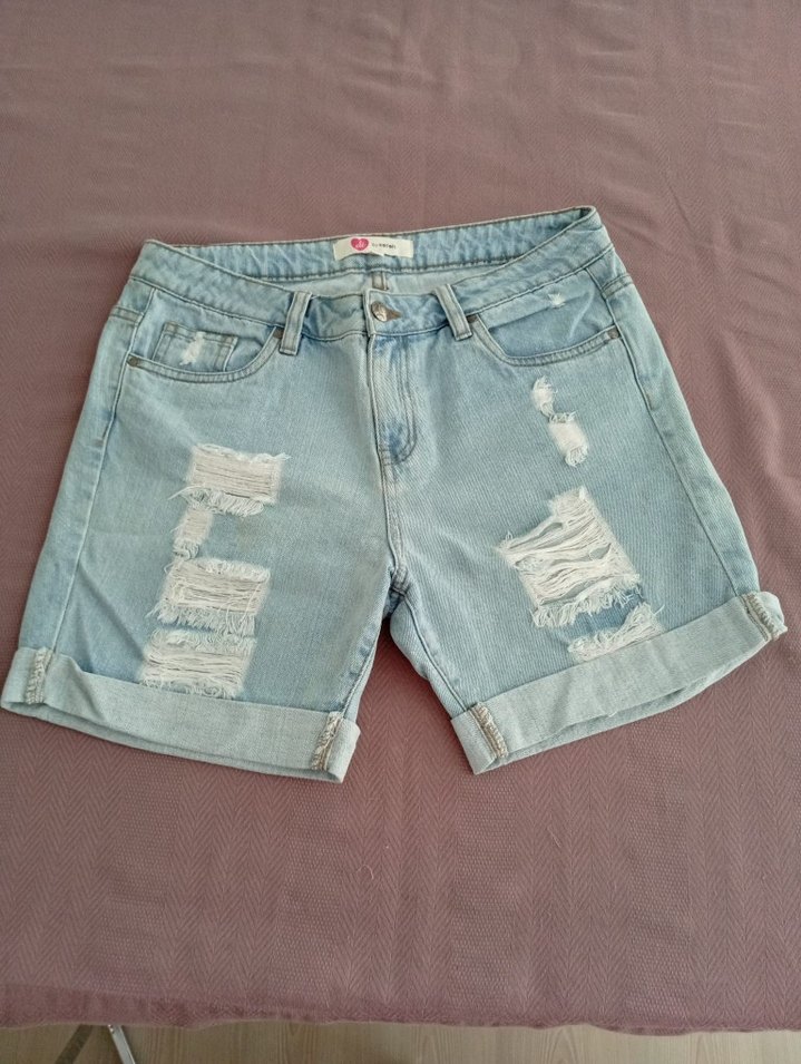 Yırtık detaylı, rahat kesim kadın kot şort, kıvrımlı paçalar ve pastel tonuyla günlük kullanım için uygundur.