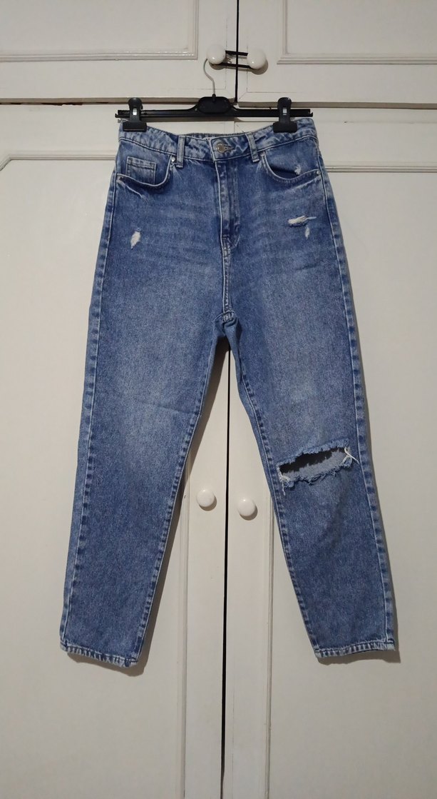 Salaş kesim, yırtık detaylı midi boy kot pantolon. Günlük kullanıma uygun, rahat ve şık bir sokak stili parçası bel36 boy 96cm.