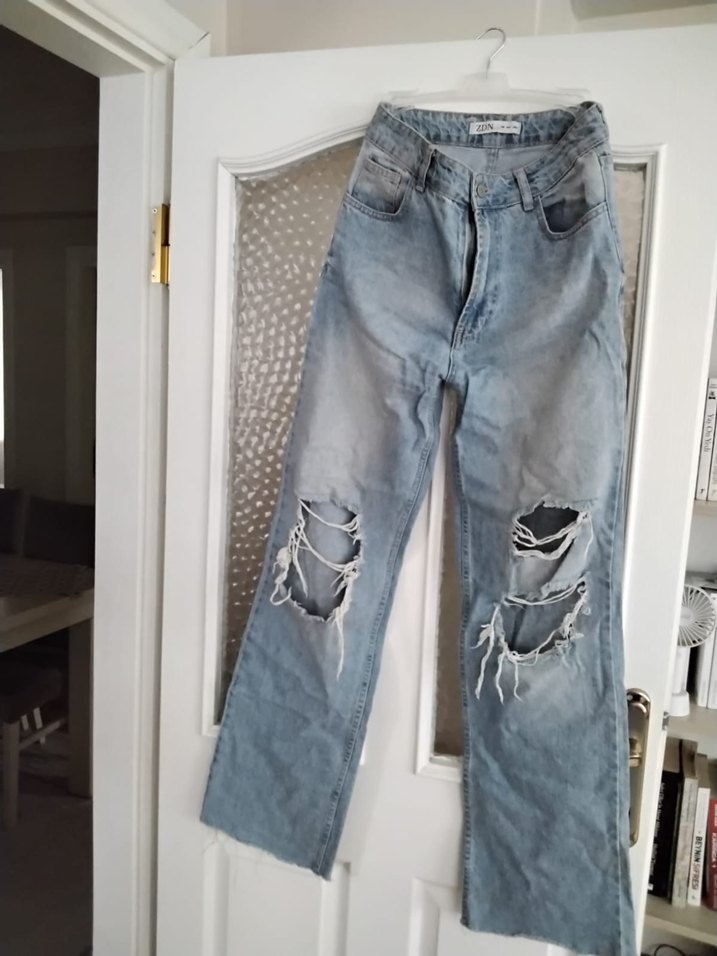 Salaş kesim, yırtık detaylı mavi denim kadın jean, normal midi boyda, günlük kullanım için uygundur.
