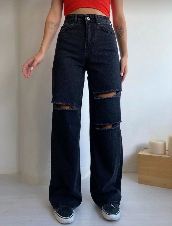 Yırtık Detaylı Siyah Salaş Kadın Kot Pantolon