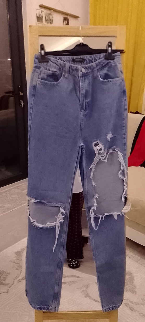 mavi renkte, yırtık detaylara sahip bol kesim denim kot pantolon. Günlük kullanım için uygun, salaş ve sokak modasına uygun. uzunluğu 113 cm paça genişliği 23 cm bel çevresi 72 cm kalça çevresi 100 cm