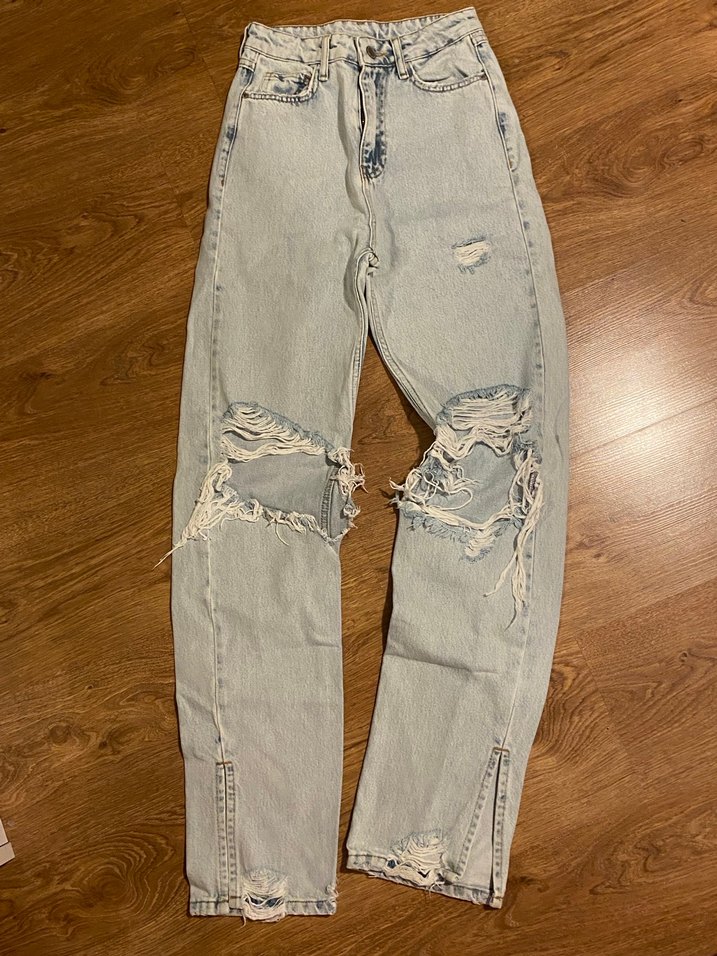 Açık mavi renkli, mom jean high rise kesim kadın denim pantolon; yırtık detayları ve paça yırtmaçlarıyla günlük rahat sokak stili sunar. Pazarlık payı vardır 34 beden uyumlu ölçülerini isterseniz eklerim. Marka temsilidir, butik ürünüdür.