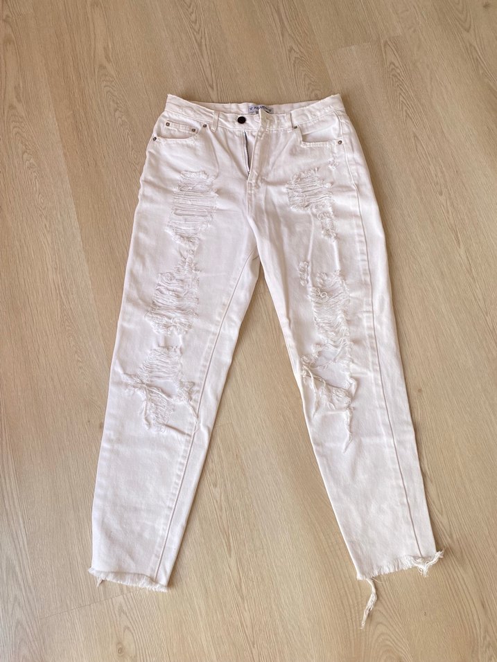 Yırtık detaylara sahip loose fit denim kadın jean, günlük kullanım için zahmetsiz şıklık sunar.
