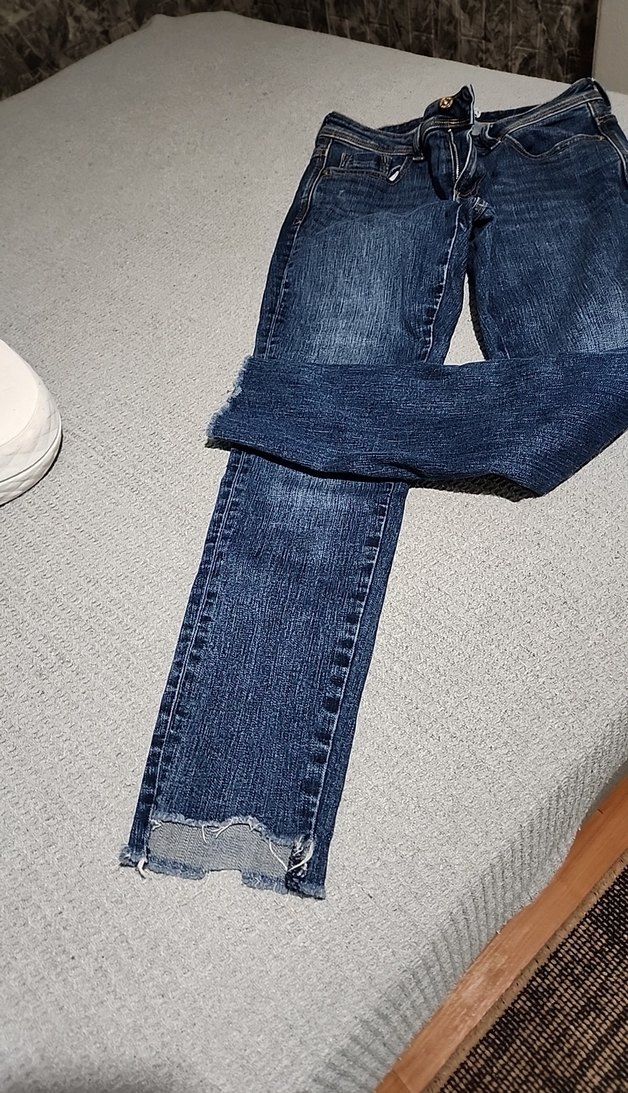 Gri tonlarında mavi denimden, yırtmaç detaylı ve kesik paçalı, normal boy kadın pantolon. Günlük kullanıma uygun.