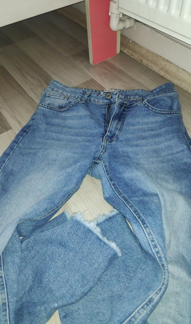Mavi denimden yapılmış, bol kesim ve yırtmaç detaylı midi boy jean. Günlük sokak stili için uygundur, desen içermez.