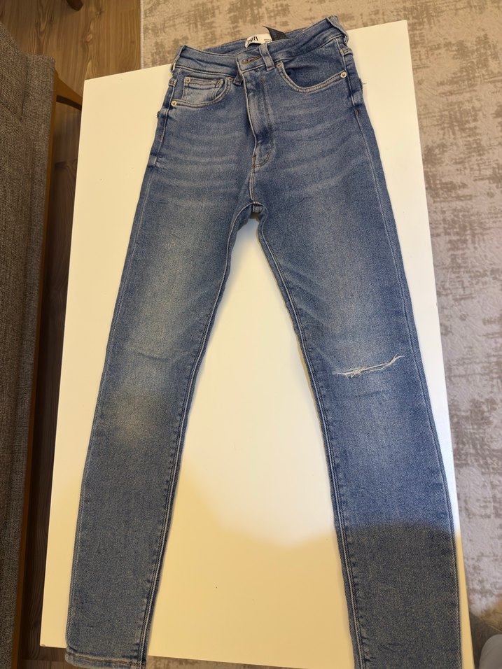 Mavi denim kumaştan, regular fit ve yırtmaç detaylı kadın kot pantolon, günlük kullanım için rahat ve şık bir seçim. ️