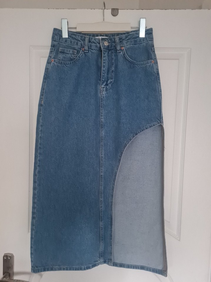 Mavi midi boy regular kesim denim etek, yırtmaç detayıyla günlük şıklık sunar. Beşiktaş çarşısından aldık. Belki 2 belki 3 kez giyildi. Kullanma ortamımız kısıtlı olduğu için daha fazla giyemedik , o yüzden satışa koyalım dedik. Satılınca parası malum, kızıma harçlık olarak gidecek. Kıyafet onun çünkü. Güzel ve makul bir duruşu var. Yırtmacı çok afilli. Tavsiyemdir, buyrunuz alınız. #kadın #genç #kotetek #kot #etek #gap #parkbravo #roman #tüzün #ipekyol #mavi #beymen #boyner #defacto #twist #tommyhilfiger #stradivarius #stefanel #bershka #herry #derhy #lacoste #colins #markspencer #hm #ekol #koton #adilışık #oxxo #zara #yargıcı #mango #pologarage #lcw #ole #uspolo #benetton #bmclub #jimmykey #maxxmara #network #mudo #vakkorama #vakko #fabrika #sabriözel #journey #nautica #javelin