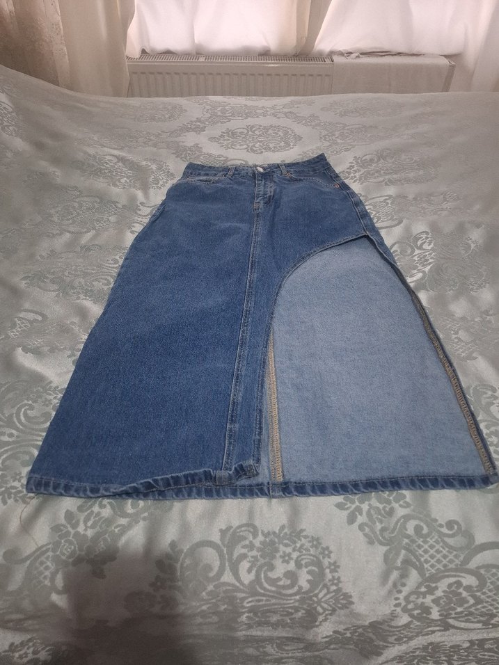 Uzun mavi denim etek, yırtmaç detayı ve bol kesimiyle rahat bir kullanım sunar. Günlük sokak stiline uygundur.