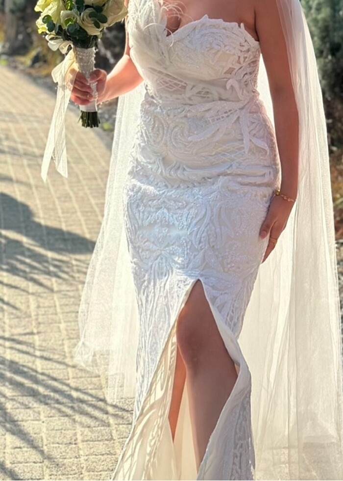 Bir kere evden çıkarken giydim. Tertemiz. Balık yırtmaçlı uzun gelinlik.
