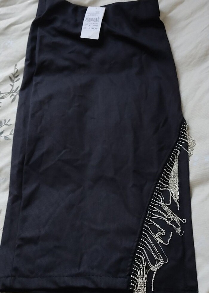 Yırtmaç kısmı taş detaylı siyah etek hiç kullanılmamıştır