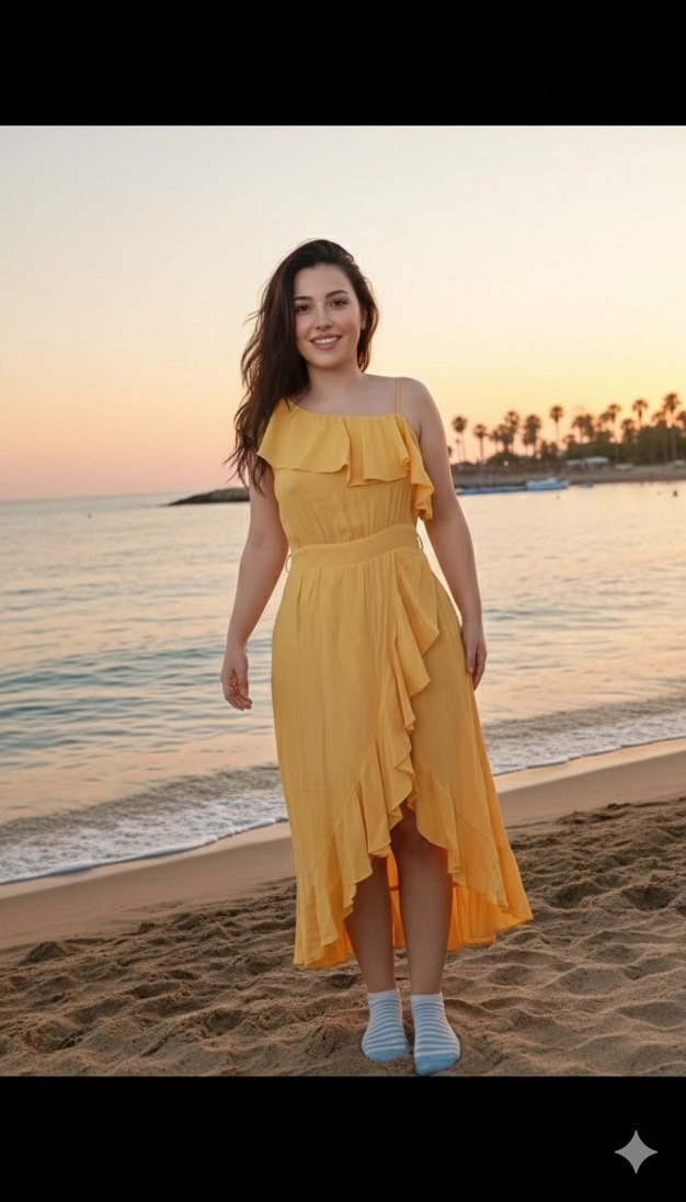 yırtmaçlı fırfırlı sarı uzun elbise ml beden olur