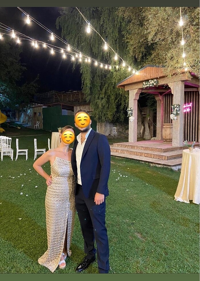 Ankarada hanımefendi mağazasından alındı. Önden yırtmaçlı gold renkte elbise. Bir kez giyildi . Yeni gibi. Elbisenın boyu 145 cm önden yırtmaçlı Gögüs kısmı 40 Bel 38 Basen 49