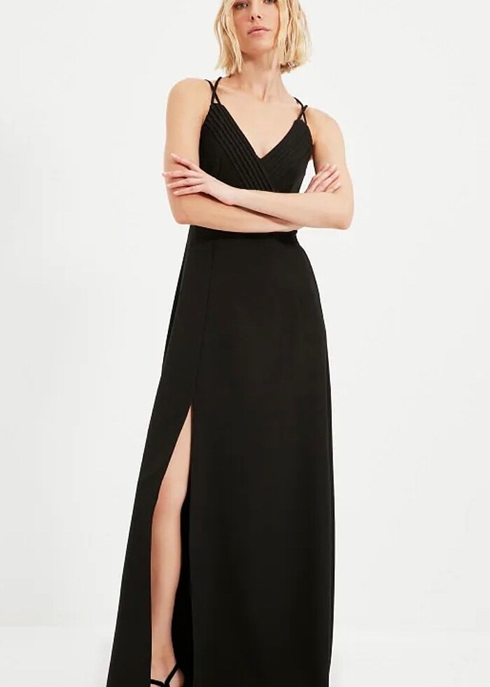 Yırtmaçlı nervür detay askılı abiye elbise