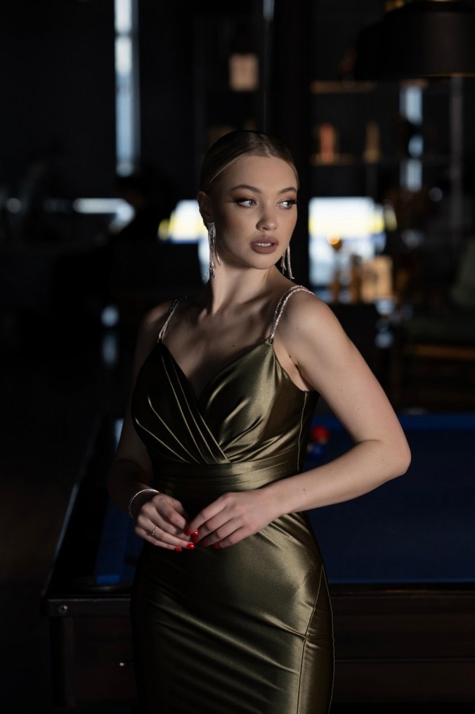 Parlak haki renkte, taş askılı uzun ve abiye elbise. Sıkı kesimi ve modern tarzıyla gösterişli davetler için ideal. ✨ 1 kere kullanıldı 40-42 beden ile uyumlu . Boyum:165cm topuklu ayakkabım :8-10 cm civarı