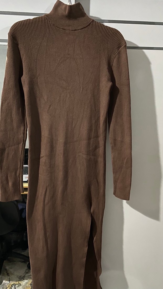 Kahverengi, uzun kollu, yüksek yakalı, triko dokuma, dar kesim, günlük kullanıma uygun rahat ve şık kadın elbisesi.