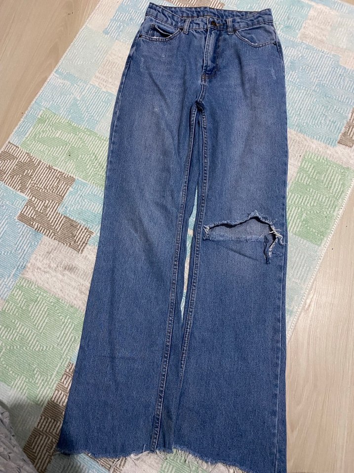 , yırtmaç detaylı, bol kesim kadın jean. Denim kumaştan, günlük rahat