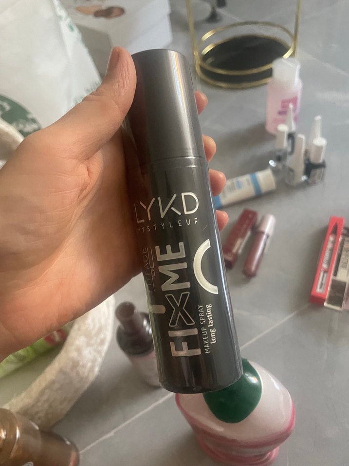 YKD Fix Me makyaj sabitleyici sprey, uzun süre kalıcı ve taze bir görünüm sağlar. Haki renkli, gri şişede şık tasarıma sahiptir.
