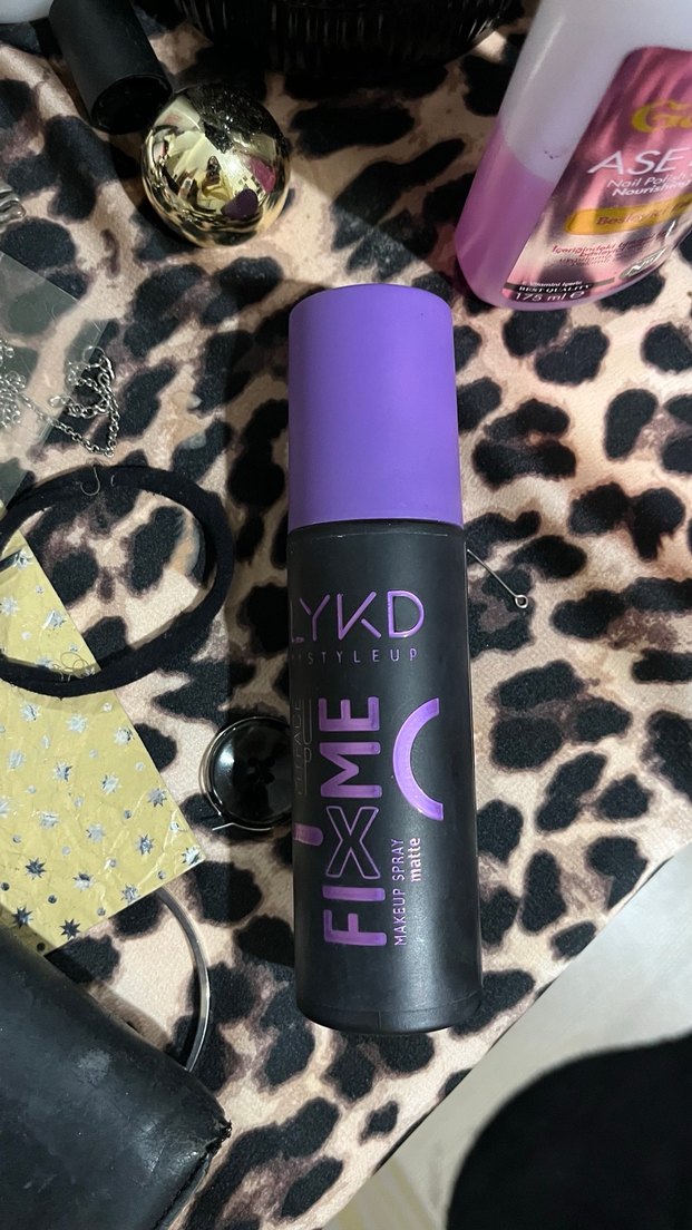 YKD Fix Me mat makyaj sabitleyici sprey, makyajınızı uzun süre sabit tutar ve pürüzsüz bir görünüm sağlar. Mor kapaklı şişede sunulur.