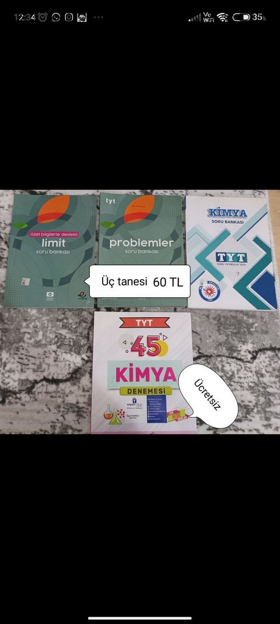 TYT kimya soru bankası ve denemesi içeren set. Problemler, limit ve kimya konularını kapsayan 3 kitap. Üçü toplam 59 TL. Tyt biyoloji olanı biraz çözülmüş.