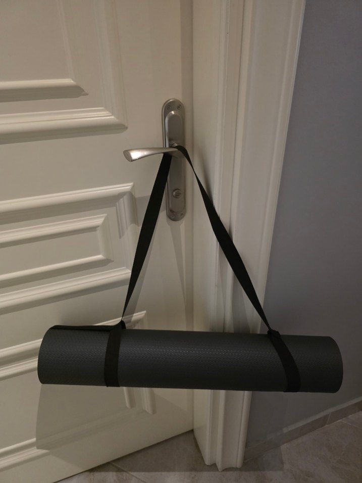 Taşıma askılı siyah egzersiz yoga matı, rahat egzersiz için uygundur. görselde görünen bir baskı hatası mevcuttur ancak kullanıma engel değildir. hiç kullanılmamıştır. 180 X 59 5mm