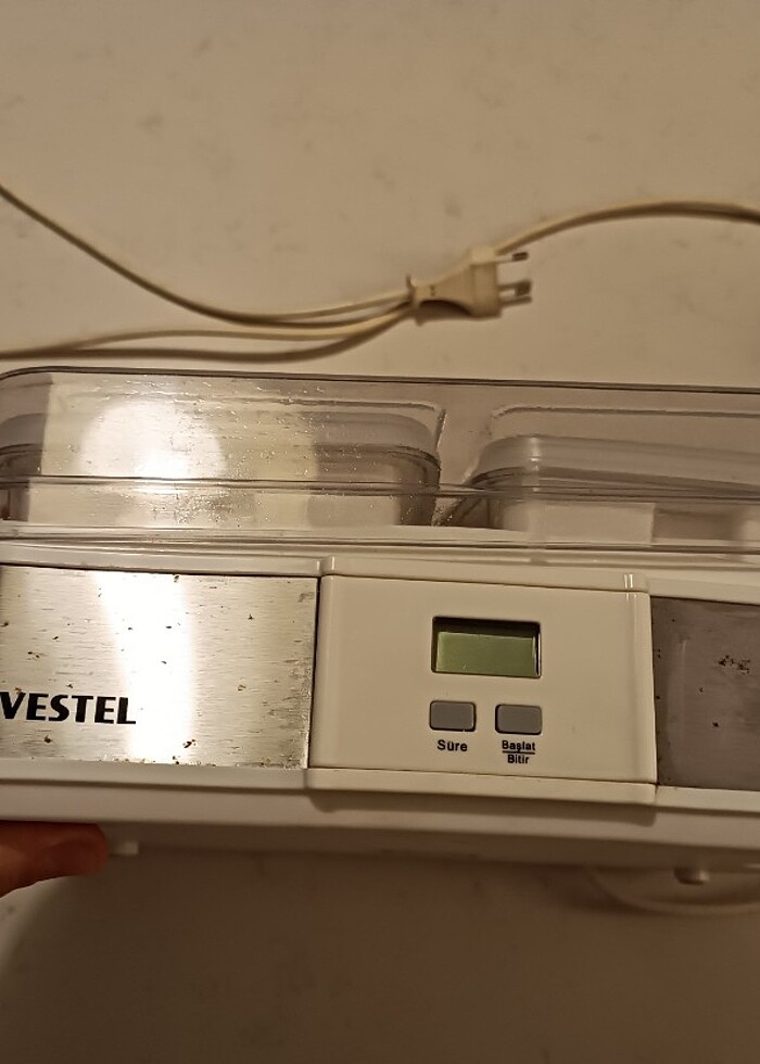Vestel yoğurt makinası. Çalışıyor. Dış kapağında çatlak var ,son fotoğrafta belli oluyor. İçinde iki adet dikdörtgen süzgeçli kabı mevcut.