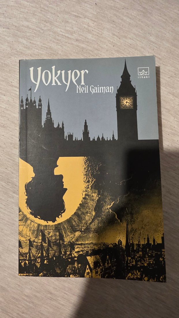 Neil Gaiman'ın Yokyer adlı romanı, karanlık ve atmosferik bir kapak ile şehir silüeti ve saat kulesi görselleri içerir.
