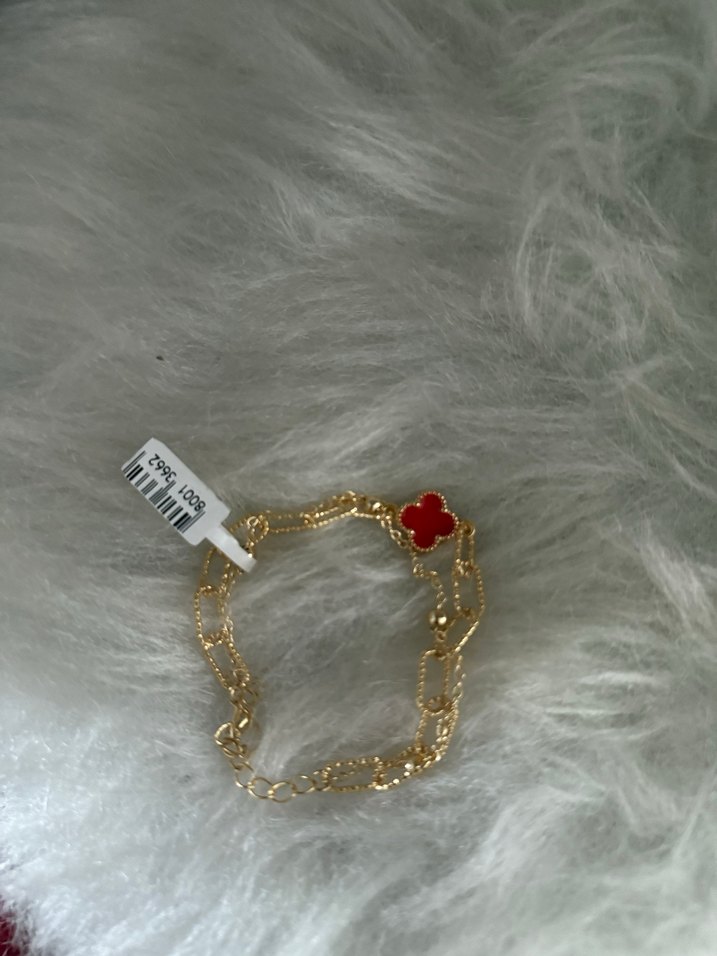 Günlük sokak stiline uygun, zincir detaylı ve kırmızı yonca figürlü altın renkli kadın bileklik.