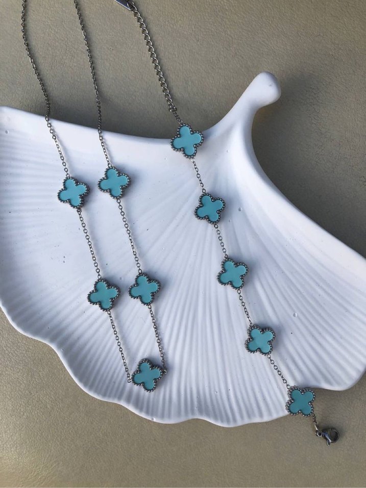 Yonca detaylı ve işleme desenli, minimal bohem tarzda turkuaz kolye, günlük kullanım için uygun. #yoncakolye #yoncabileklik #çelikküpe #çelikkolye #çelikyüzük #çeliktakı #toptantakı #xupingtakı #xupingküpe #xupingkolye #çelikbileklik #xupingbileklik #halkaküpe #viptakı #kelebekkolye