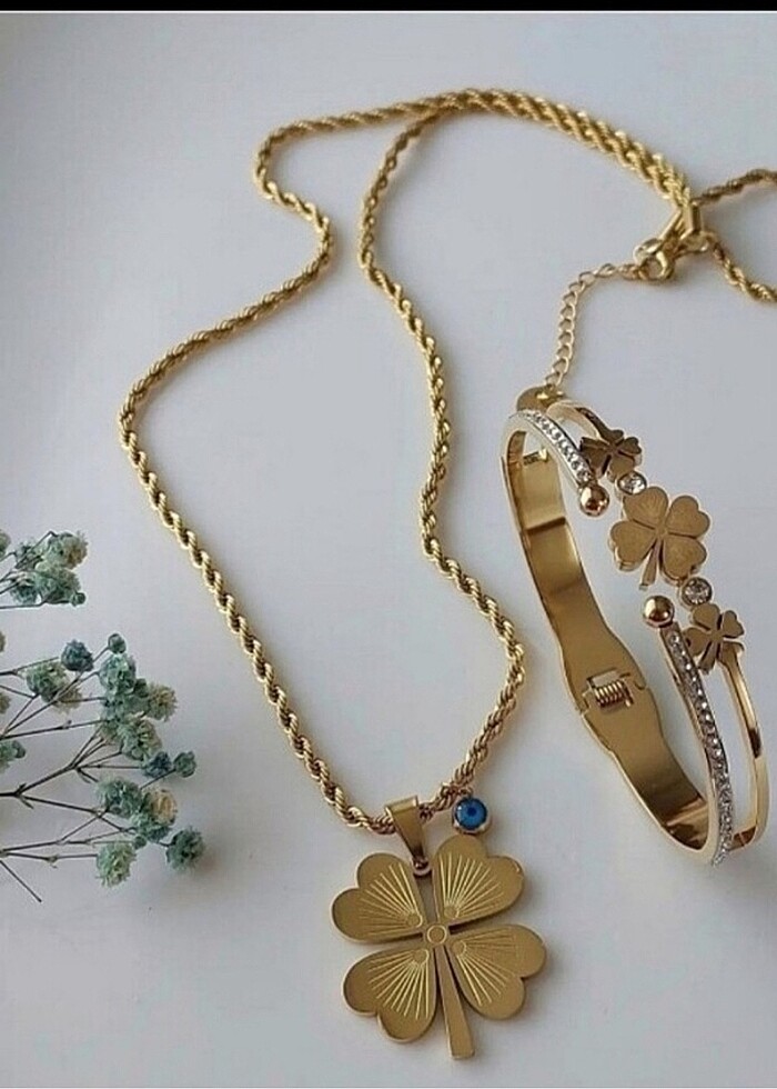 YONCALI ÇELİK SET YONCA UÇLU KOLYE VE YONCA KELEPÇE Antibakteriyeldir Kararma yapmaz 1.sınıf çelik