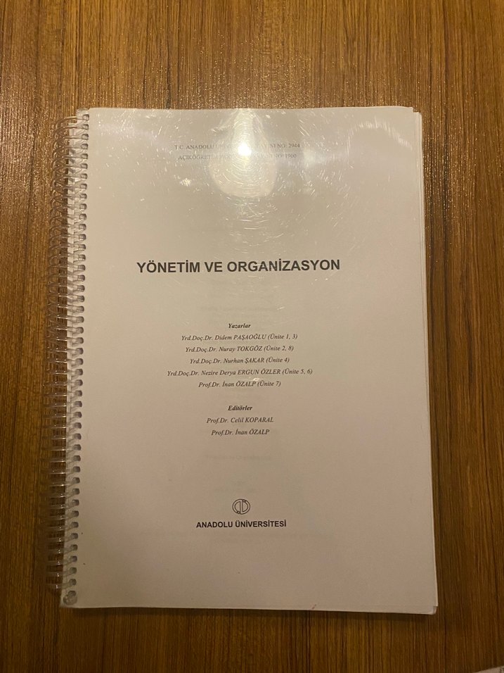 Anadolu Üniversitesi tarafından yayınlanan, yönetim ve organizasyon konularını içeren spiral ciltli akademik ders notları.
