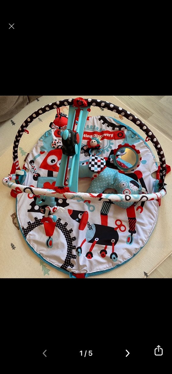 Asılı oyuncaklar ve küçük ayna içeren renkli tekstil bebek oyun matı. Bebeklerin duyusal gelişimi için uygundur. Bütün parçaları sağlam ve çalışıyordur.
