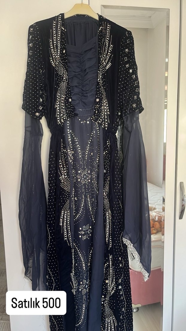 Uzun siyah elbise, V yaka ve uzun şeffaf kollu drapeli tasarıma sahiptir. Rahat kesimli ve desenli, düğün ve bohem tarzlar için uygundur.