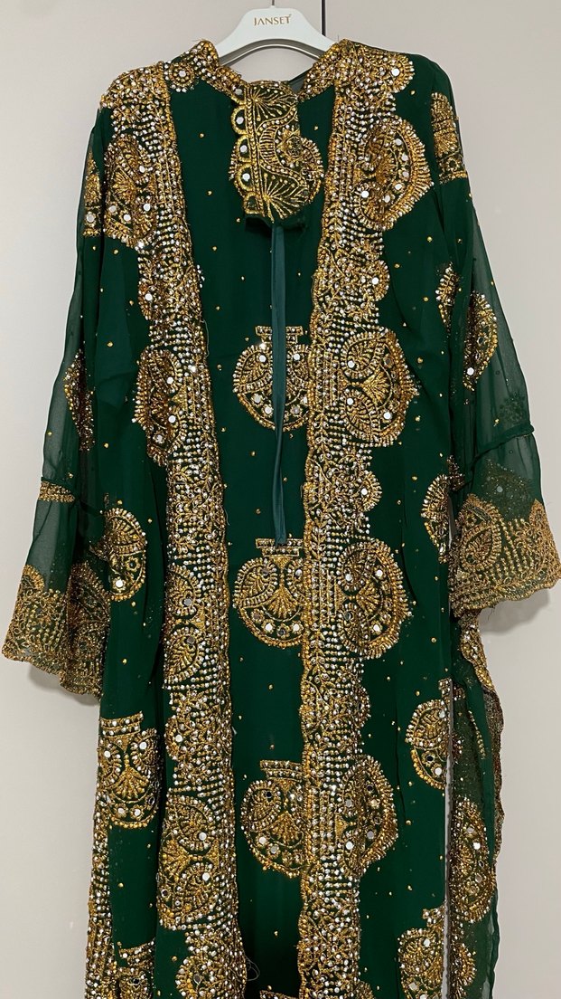 Uzun, yeşil ve boncuk işlemeli bu kına elbisesi, bol kesim, uzun kollu ve yakası çıtçıtlıdır. Parlak altın desenleriyle bohem stilini yansıtır. ✨