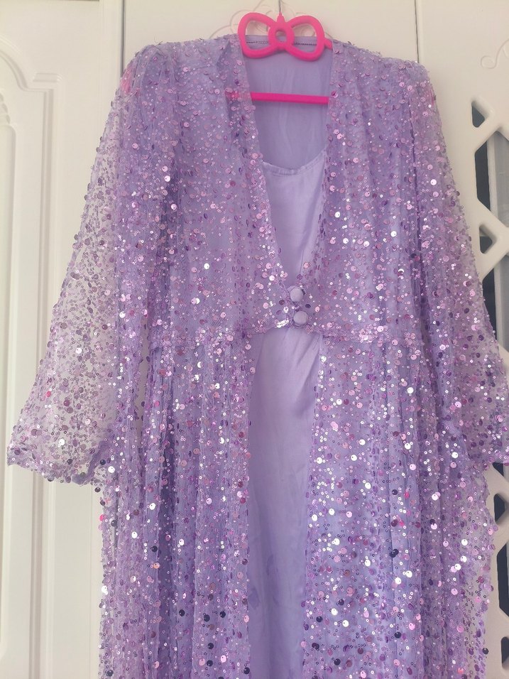38 40 bedene kdr olur Parlak mor kumaştan, uzun ve bol kesim kadın sabahlık. Uzun kollu ve göz alıcı goth tarzında, ışıltılı ve desensiz.