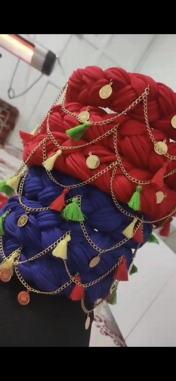 Sentetik kumaştan, püsküller ve madeni para süslemeli zincirlerle renkli bohem kadın fularları. Retro ve hippie tarzına uygun.