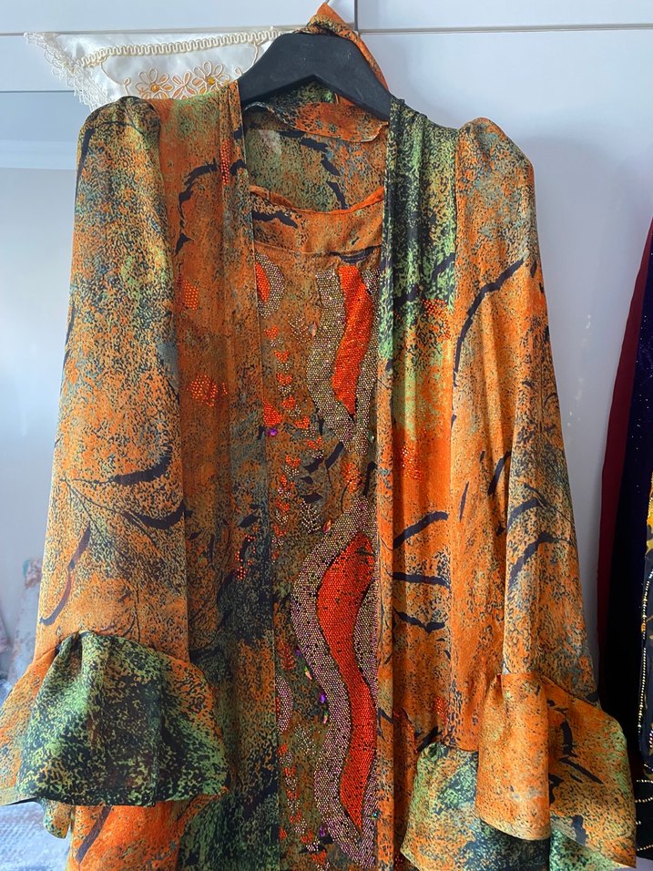 Ürün dubai kumaş olup özel dikimdir. 1 defa tek giyildi. Taşları çok ağır işlemelerdir. Kaftan şeklinde 2 parça olarak dikilmiştir. Aynı kumaştan parça vardır.