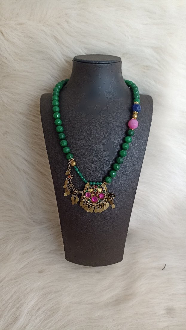 Yörük işi otantik kolye ucu ile yeşil ve renkli boncuklarla kombinlenmiş tasarım kolye. Günlük kullanım için uygundur, bohem tarzda.