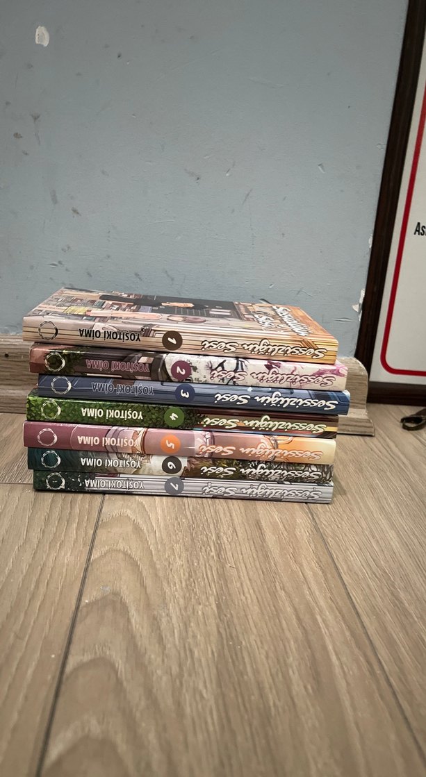 Yostoku Oima'ya ait yedi cilt manga kitabı seti, ahşap zemin üzerinde istiflenmiş.