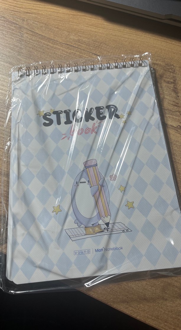 Mavi pastel renkte, spiralli kapaklı sticker defteri. Penguen ve kalem çizimi bulunur, "STICKER book" yazılıdır.